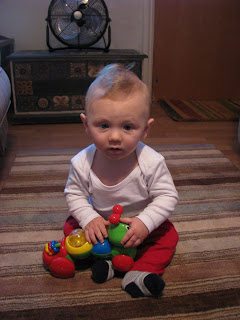 I am such a clever boy because I have learned to sit up all by myself! Mummy has to keep a watchful eye over me though as I have a tendency to lose focus and then I fall down! Mummy and Daddy bought a very nice rug for the living room just for me so I can practise my sitting and my crawling in comfort and style. Thanks to Auntie Bel who helped Mummy choose it. We enjoyed sending the men running around after us in John Lewis. I like to sit near to the sofa so that I can scratch it (it saves Mummy cutting my fingernails!) and I like to sit up so I can play with my wobbly duck and my caterpillar that makes silly sounds that drives my Mummy so insane that she regularly reaches for the 'off' button. Soon my hand / eye co-ordination will be so good that I will just turn it back on again!
